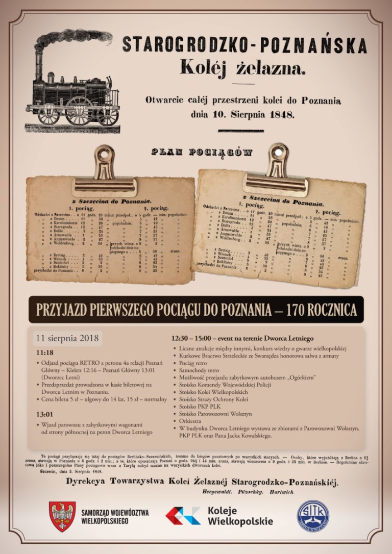 W tym roku w sierpniu minie 170 lat od uruchomienia pierwszego połączenia kolejowego z Poznania. Dokładnie 10 sierpnia 1848 roku trasa kolejowa połączyła Poznań i Szczecin jako Kolej Żelazna Starogrodzko-Poznańska.