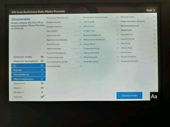 W czasie sesji pod głosowanie poddano 74 poprawki, które w większości zgłosili radni opozycji. Wszystkie zarówno przez prezydenta Jacka Jaśkowiaka, jak i Radę Miasta zostały odrzucone. Budżet na 2020 rok i Wieloletnia Prognoza Finansowa zostały uchwalona 23 głosami za, przy 9 przeciw, 2 wstrzymujących się.