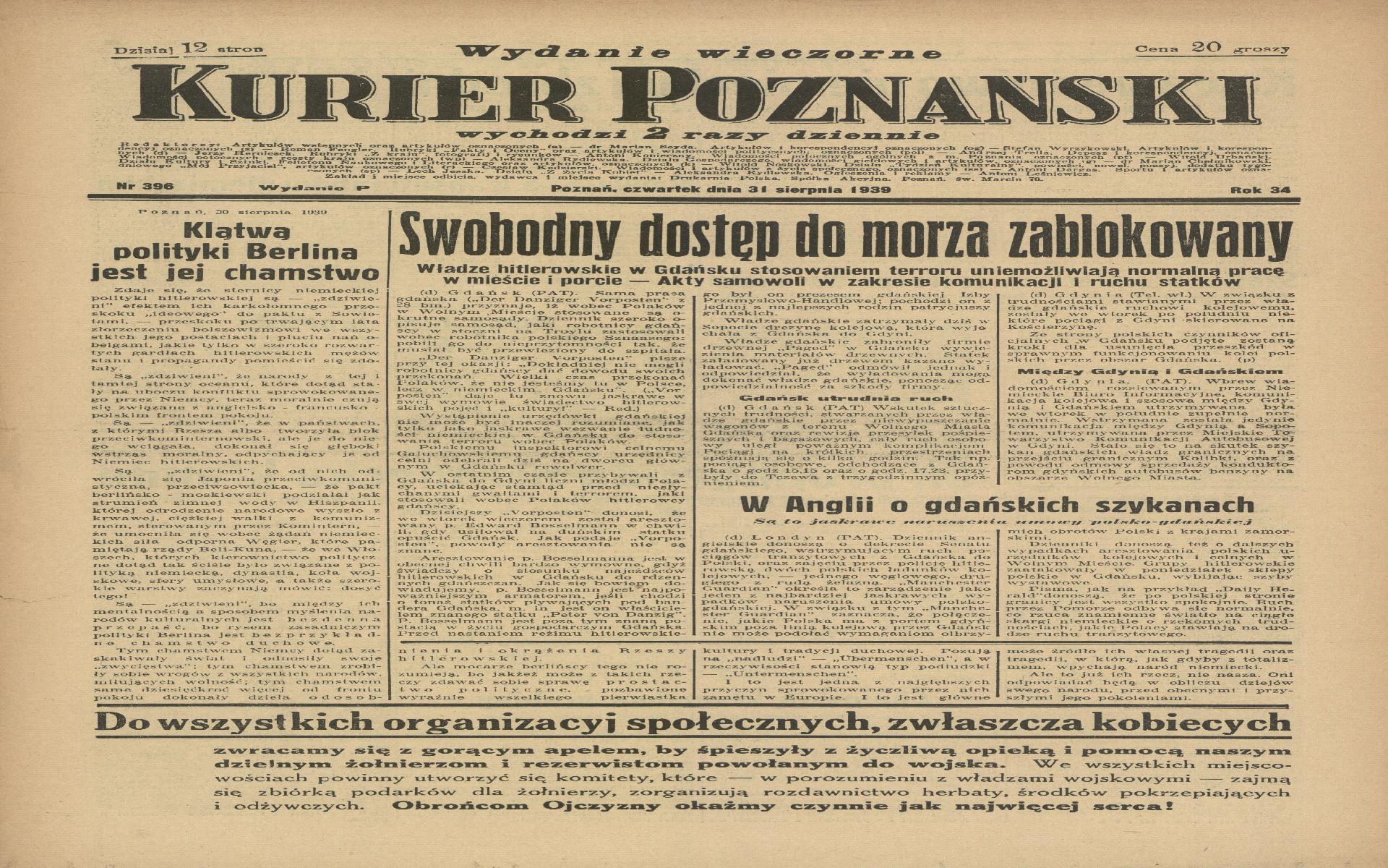 1 września 1939 roku o świcie nazistowskie Niemcy uderzyły na Polskę. Tego dnia poznaniaków obudził komunikat Polskiego Radia: "A więc wojna! Z dniem dzisiejszym wszelkie sprawy i zagadnienia schodzą na plan dalszy. Całe nasze życie publiczne i prywatne przestawiamy na specjalne tory, weszliśmy w okres wojny. Cały wysiłek narodu musi iść w jednym kierunku. Wszyscy jesteśmy żołnierzami. Musimy myśleć tylko o jednym - walka aż do zwycięstwa!".