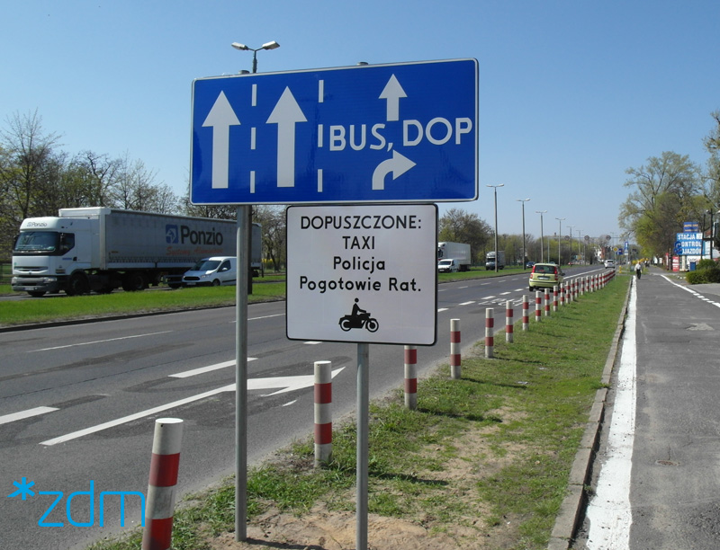 O tym, że dany pas jest buspasem informują znaki pionowe, na których oprócz znanego napisu BUS jest też namalowane DOP, czyli DOPUSZCZONE, a poniżej znajduje się wyjaśnienie jakie są to pojazdy. Na jezdniach natomiast są już napisy: BUS, DOP. Nowy buspas służy także kierowcom, którzy skręcają w prawo w osiedlowe uliczki i umożliwia bezpieczniejszy wyjazd z nich na bardzo ruchliwą ul. Warszawską.