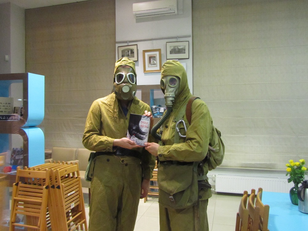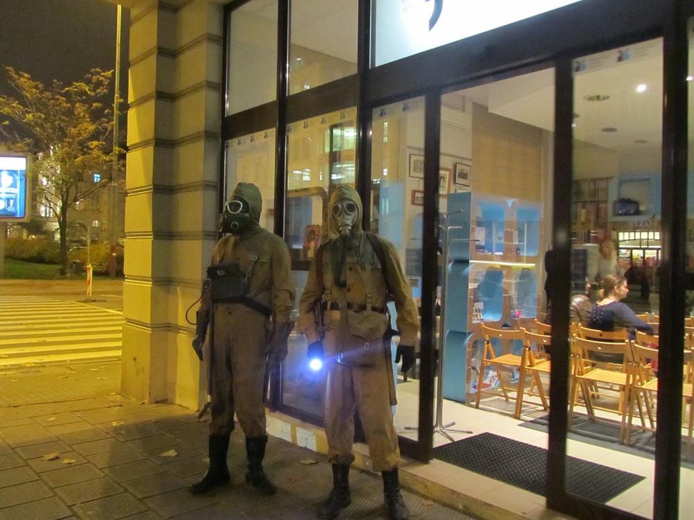 Był też czas na autografy i dedykacje. Podczas spotkania towarzyszyły nam dwie postacie, które przybyły prawdopodobnie ze zwycięskiego opowiadania Pauliny Rezanowicz "Filantropia kontra eksploracja". Sprawdzili czy powietrze, którym oddychamy nie jest skażone. Wiemy też, że prowadzili jakieś pomiary na remontowanej części ulicy Święty Marcin, co zostało zarejestrowane przez reportera Głosy Wielkopolskiego (zdjęcia można obejrzeć tutaj). Po spotkaniu prawdopodobnie wrócili do opowiadania.