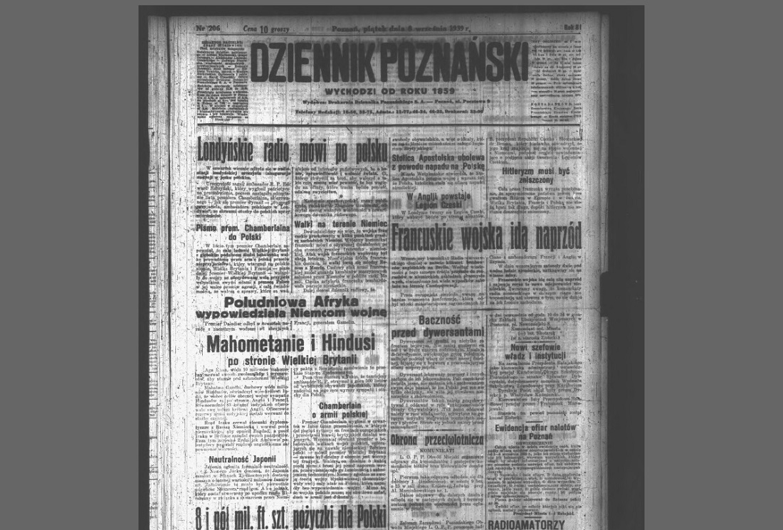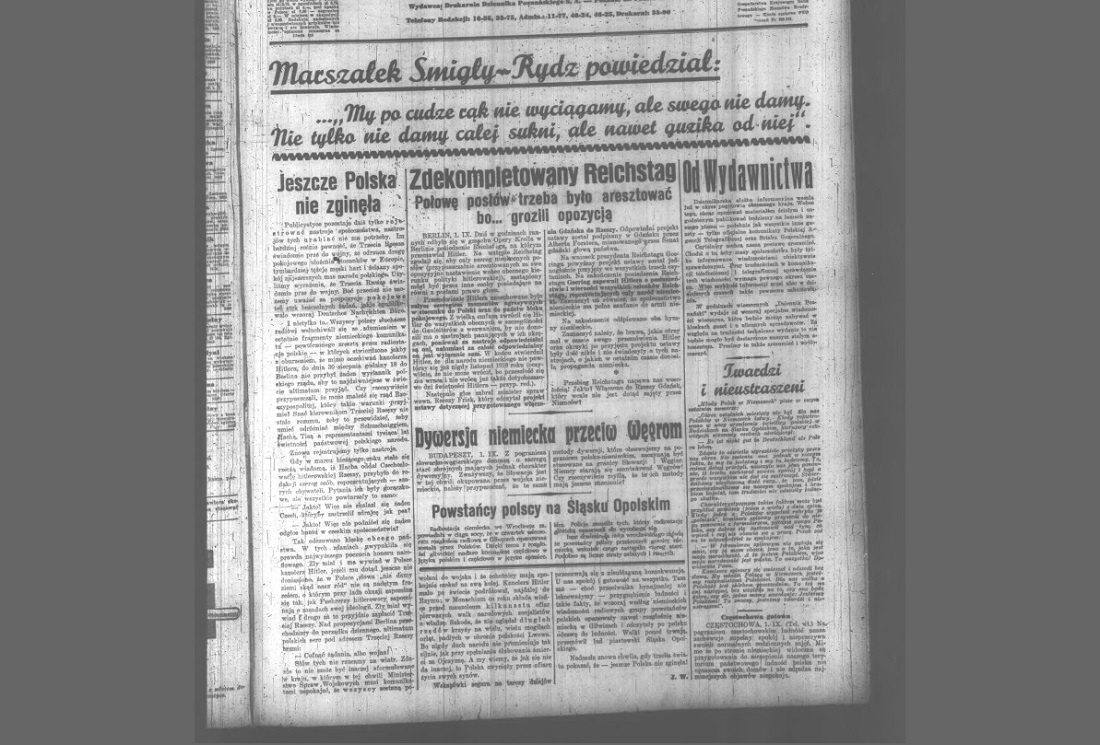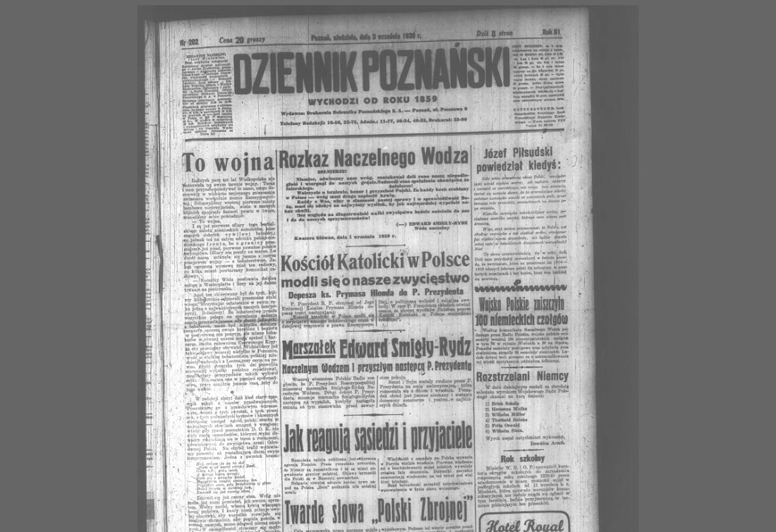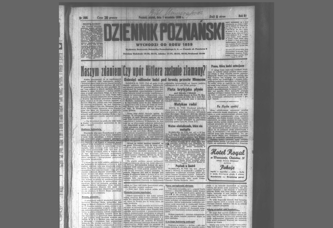 1 września 1939 roku "Dziennik Poznański" dość optymistycznie tytułuje artykuły na pierwszej stronie zamieszczone pod ogólnym hasłem "Czy opór Hitlera zostanie złamany", "Dziesięć milionów ludzi pod bronią przeciwko Niemcom", "Flota brytyjska płynie", "Watykan radzi", "Na Śląsku spokój". Przewijają się w nich takie i podobne zdania: "Niemcy prą do wojny, którą mają już przegraną"...