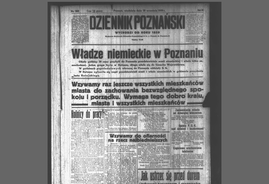 W niedzielę 10 września ukazało się ostatnie, jednostronicowe wydanie "Dziennika Poznańskiego" z dramatycznym tytułem "Władze niemieckie w Poznaniu". Gazeta apeluje o zachowanie spokoju...