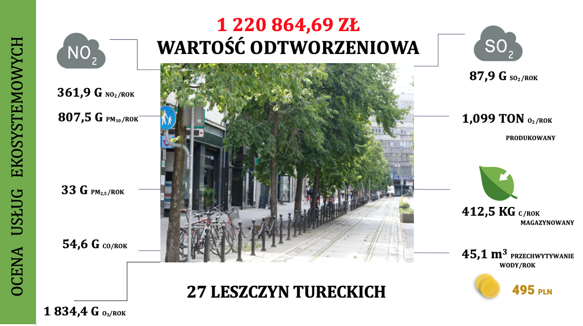 W ekspertyzie wyliczona została wartość odtworzeniowa oraz ocena wybranych usług ekosystemowych dla 27 drzew. Łączna wartość odtworzeniowa opracowywanych drzew wynosi 1.220.864,69 zł. Łączna ilość pochłanianych zanieczyszczeń przez drzewa wynosi 31,79 kg/rok. Łączna wartość produkcji tlenu wynosi 1099,7 kg/rok. Łączna wartość usługi przechwytywania wody wynosi 495 zł/rok. Łączna wartość usługi pochłaniania zanieczyszczeń wynosi 98,14 zł/rok, a wartość usuwanego CO2 wynosi 24,8 zł/rok.