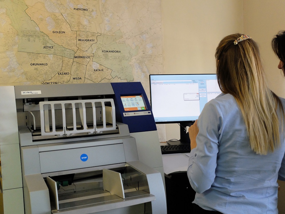 W ramach projektu zakupiono trzy specjalistyczne urządzenia skanujące: do skanowania dokumentów do formatu A0, zszytych dokumentów A3 oraz pojedynczych kartek do formatu A3. Obecnie urządzenia wykorzystywane są w siedzibie GEOPOZu do zadań związanych z cyfryzacją zasobu. Po zakończeniu projektu będą wykorzystywane do skanowania na bieżąco dokumentów i utrzymywania bazy w wersji cyfrowej. Po zakończeniu projektu powierzchnia Poznania oprócz pokrycia w 100% cyfrową mapą ewidencyjną i zasadniczą zostanie uzupełniona dokumentami przetworzonymi do postaci cyfrowej. Oznaczać to będzie łatwiejszy dostęp do materiałów zasobu poprzez wprowadzenie elektronicznych usług publicznych.