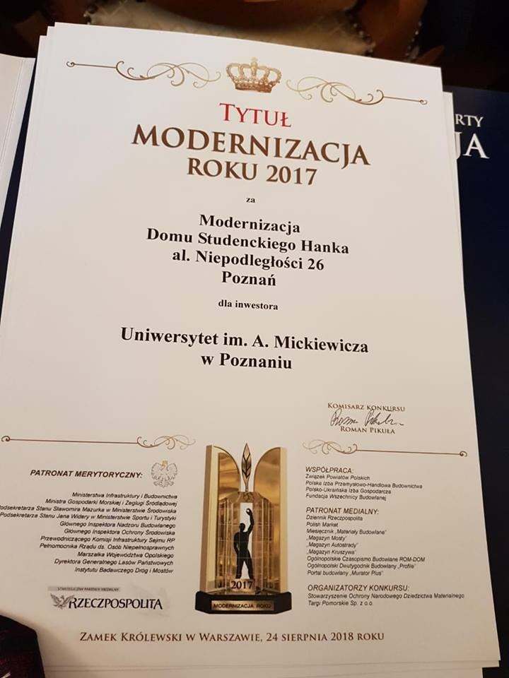 Nagrodę na Zamku Królewskim w Warszawie odebrali Kanclerz UAM Stanisław Wachowiak, zastępca Kanclerza Marek Sobczak oraz projektant Grzegorz Tracz. Projekt architektoniczny modernizacji powstał w pracowni projektowej IRON TOWER INVESTMENT Paweł Wieczorkiewicz S.K. Generalnym wykonawcą była firma SKANSKA.