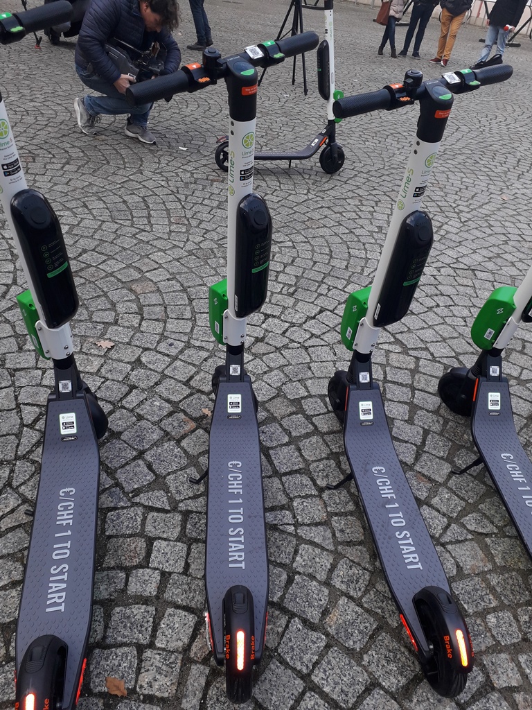 Podczas prezentacji na dziedzińcu Urzędu Miasta hulajnogi sprawdzali m.in. prezydent Jacek Jaśkowiak, przewodniczący Rady Miasta Grzegorz Ganowicz i radna Dominika Król.