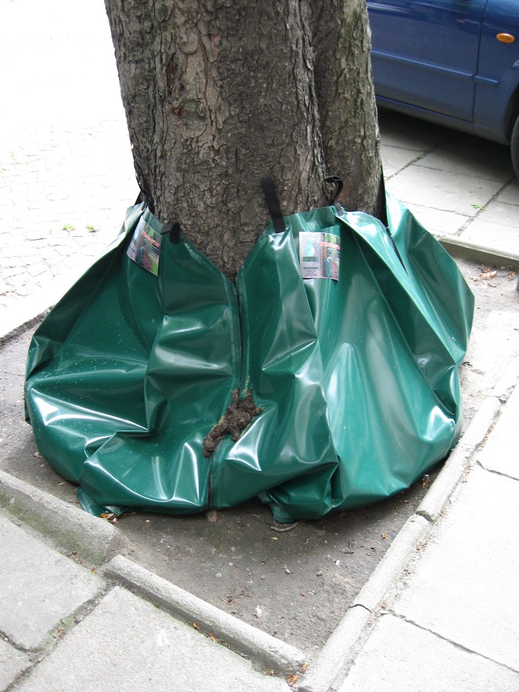 Zakupiono 200 worków o pojemności 60-70 l. Przy dużych drzewach można zamontować 3- 4 worki, czyli około 60 drzew w ten sposób będzie podlewanych w tym sezonie. Worki spinane są zamkiem, nie ma żadnej ingerencji w pień drzewa.