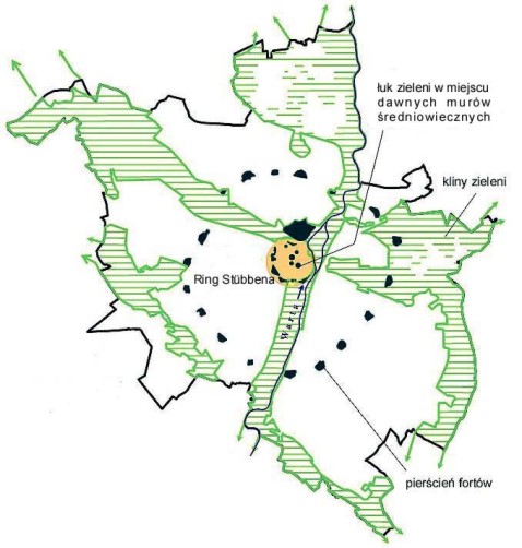 Cztery główne, wyżej w skrócie opisane kliny, uzupełniono dwunastoma mniejszymi oraz dwoma pierścieniami zieleni. Pierwszy z nich, zaprojektowany jeszcze na początku XX wieku przez Hermanna Josepha Stuebbena, to system reprezentacyjnych parków i zieleńców, założonych w miejscu rozebranego wówczas wewnętrznego pierścienia fortyfikacji, a więc na osi alei Niepodległości i ul. Królowej Jadwigi. Drugi pierścień, w przybliżeniu pokrywający się z tzw. trzecią rama komunikacyjną powstał przez połączenie okręgiem drugiego pierścienia pruskich fortów, rozmieszczonych na peryferiach ówczesnego miasta.