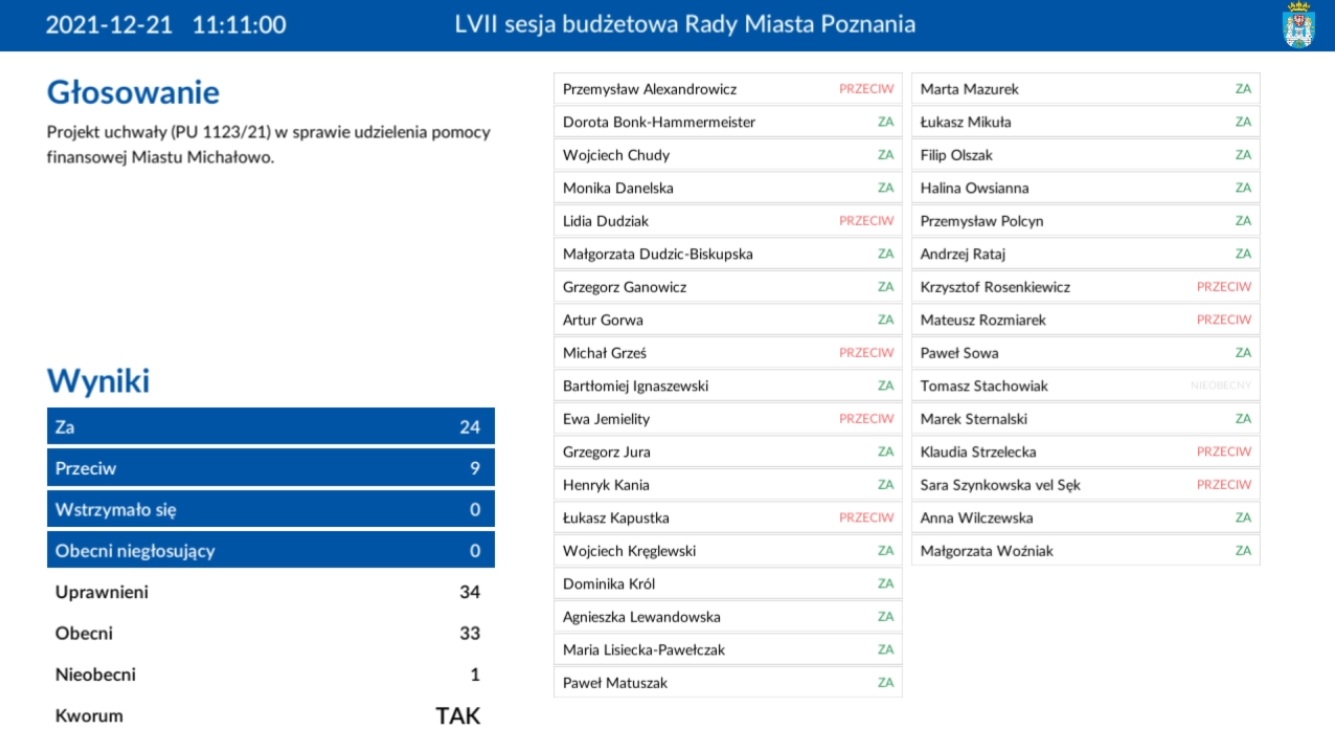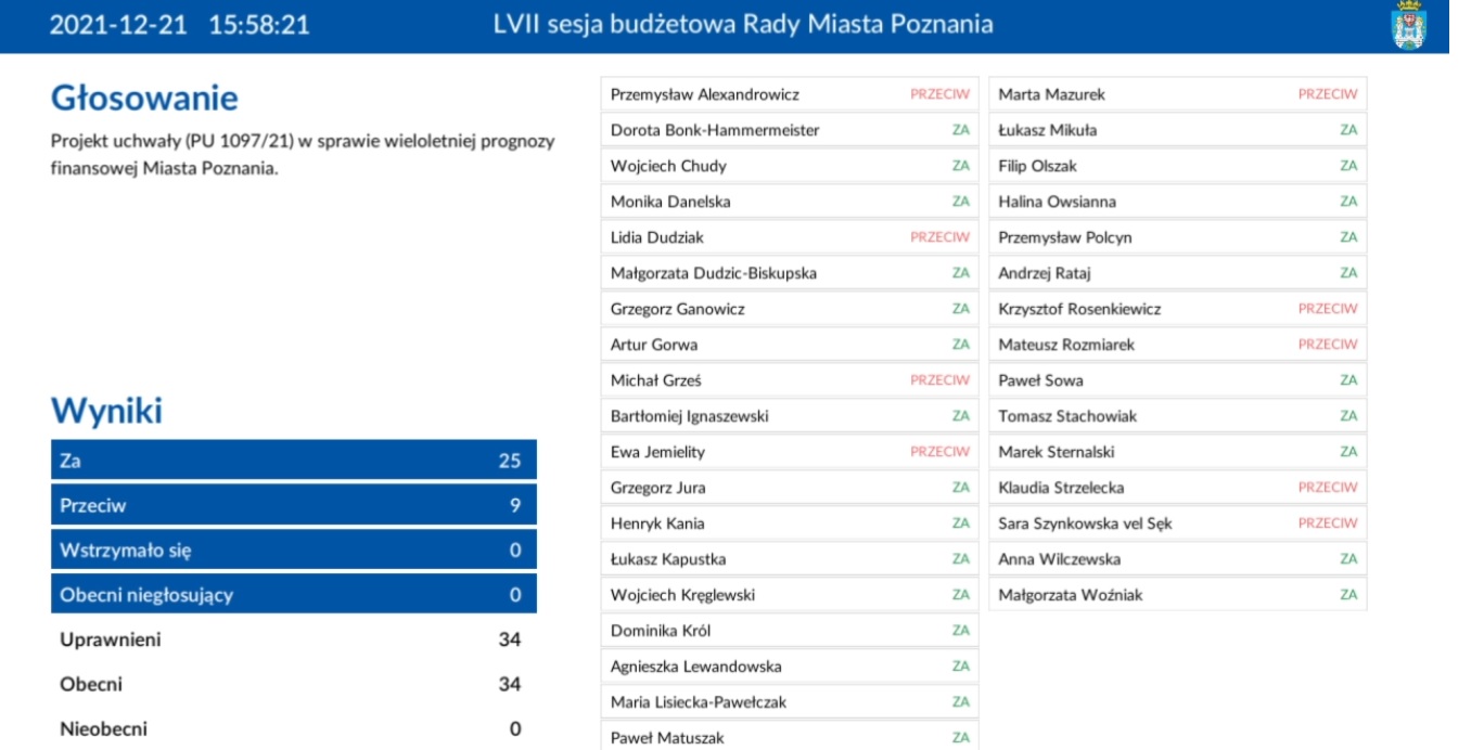 Na koniec radni przyjęli uchwałę ws. wieloletniej prognozy finansowej i oraz uchwałę ws. budżetu miasta Poznania na rok 2022. W tym ostatnim, najważniejszym w roku głosowaniu, 26 radnych głosowało za, a 8 było przeciw. (radny Kania pomylił się w głosowaniu i zgłosił to). Sesja budżetowa Rady Miasta Poznania trwała ponad siedem godzin. Odbywała się w trybie online. Zakończyła się o g. 16.35.