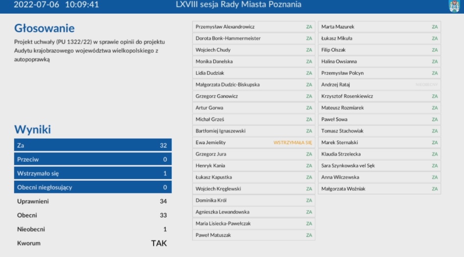 Radni Komisji Polityki Przestrzennej i Rewitalizacji przygotowali stanowisko, które będzie towarzyszyło uchwale na temat audytu. Wskazano w nim w punktach zastrzeżenia Poznania ws. treści audytu. W uchwale zawarto też załącznik z zapisem mówiącym, że w wypadku nieuwzględnienia przez zarząd województwa zastrzeżeń, miasto może złożyć protest powołując się na ustawę o planowaniu i zagospodarowaniu przestrzennym. Ostatecznie Rada Miasta Poznania przyjęła uchwałę ws. oceny audytu przy 32 głosach "za" i jednym "wstrzymuję się".