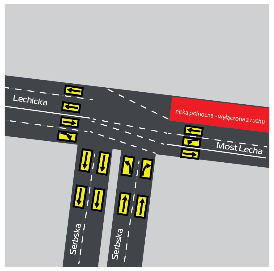 Na samym moście Lecha przez cały okres trwania inwestycji ruch pojazdów w obu kierunkach będzie odbywał się wyłącznie południową nitką, na której obecnie czynne są trzy pasy ruchu w jedną stronę, o szerokości 3,5 m każdy. Na okres czasowej organizacji ruchu po jezdni obiektu południowego odbywał się będzie ruch dwukierunkowy przy czym pasy jezdni zostaną wydzielone przy pomocy odpowiedniego oznakowania.