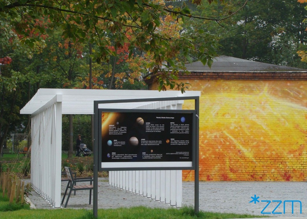 Bliskie sąsiedztwo obserwatorium astronomicznego zainspirowało projektantów by wprowadzić do parku elementy z dziedziny astronomii i kosmosu. Realizacja tego pomysłu sprawiła, że głównym elementem kompozycyjnym parku jest plac z układem słonecznym oraz pergolą, od którego rozchodzą się w różnych kierunkach alejki parkowe często swoim kształtem nawiązujące do orbit układu słonecznego. Kolejnym elementem odnoszącym się do astronomii jest "Mgławica" czyli rozległy żwirowy teren z rozmieszczonymi głazami pomiędzy, którymi posadzono krzewy byliny i trawy. W parku znajduje się również plac z układem słonecznym ułożonym ze zróżnicowanego kolorystycznie kamienia naturalnego przy którym ustawiono tablice edukacyjne przybliżające wiedzę z dziedziny astronomii. Ciekawym elementem parku jest zegar słoneczny - analemmatyczny wraz z tablicą informacyjną, w którym funkcję "polosa" czyli wskazówki rzucającej cień pełni stojąca w odpowiednim miejscu osoba.
