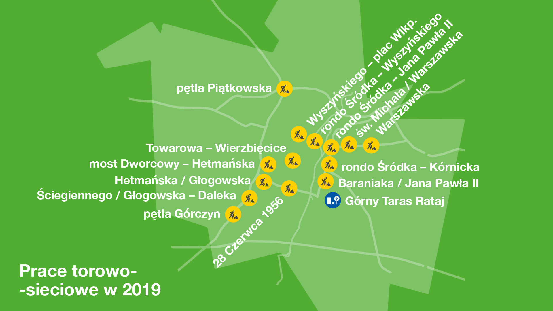 Tydzień później przeprowadzona zostanie wymiana zwrotnicy zjazdowej w kierunku Górczyna (na ul. Głogowskiej przy skrzyżowaniu z ul. Hetmańską). W związku z tym w dniach 6 i 7 kwietnia zmienionymi trasami będą kursować tramwaje linii nr 5, 8 i 14, a na odcinku Głogowska/Hetmańska - Górczyn uruchomiona zostanie linia autobusowa "za tramwaj" T5.