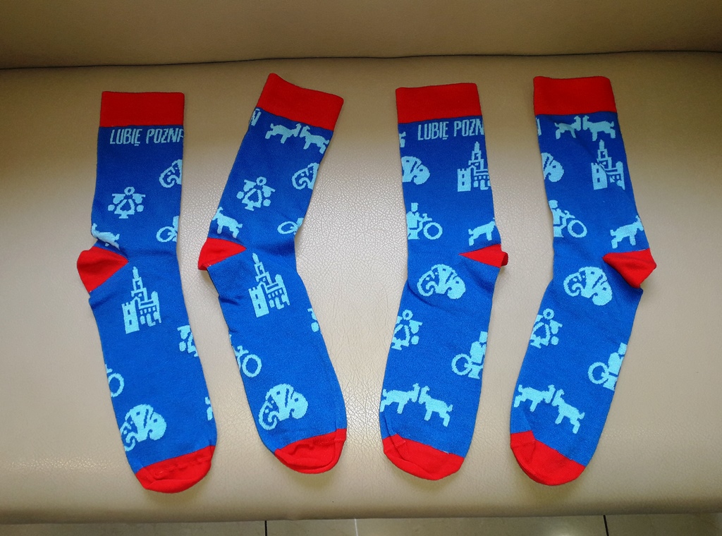 Na niebieskich bawełnianych skarpetkach (z czerwonymi akcentami na piętach, palcach i ściągaczach) widnieją graficzne symbole: Bamberki, Ratusza i ratuszowych koziołków, Rogala Świętomarcińskiego, Starego Marycha, a do tego napis "LUBIĘ POZNAŃ".