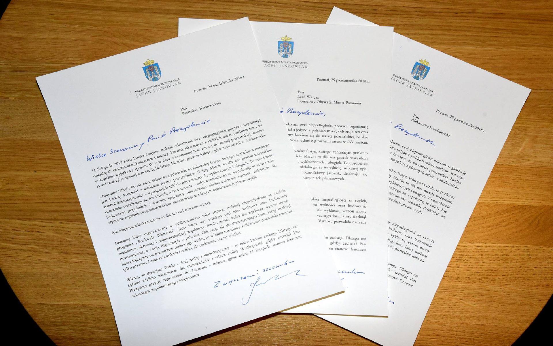Prezydent Poznania zapraszając były prezydentów RP, pisze że byłoby to zaszczytem dla mieszkańców miasta oraz podkreśla, że w Poznaniu 11 listopada stanowi fenomen wspólnego, radosnego świętowania.