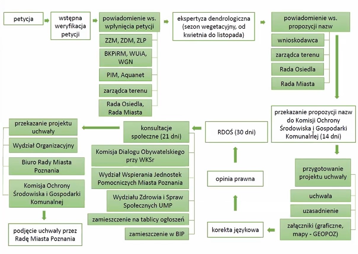 Zaprezentowane zasady procedury przewidują, że po wpłynięciu petycji i jej wstępnej weryfikacji, zawiadamiane są Rada Miasta, miejscowa rada osiedla, zarządca terenu, jednostki miejskie takie jak: Zarząd Zieleni Miejskiej, Zarząd Dróg Miejskich, Zakład Lasów Poznańskich, Poznańskie Inwestycje Miejskie, Aquanet, Biuro Koordynacji Projektów i Rewitalizacji Miasta, Wydział Gospodarki Nieruchomościami, Wydział Urbanistyki i Architektury. Następnie przeprowadzana ma być analiza dendrologiczna (sezon wegetacyjny, od kwietnia do listopada). O propozycjach nazw powiadamiani mają być wnioskodawcy, zarządca tereny, Rada Miasta, miejscowa rada osiedli. Ponadto propozycja nazw przekazana ma być do zaopiniowania Komisji Ochrony Środowiska i Gospodarki Komunalnej. Na etapie przygotowywania projektu uchwały powiadamiani mają być także m.in.: Regionalna Dyrekcja Ochrony Środowiska, Komisja Dialogu Społecznego przy Wydziale Klimatu i Środowiska. Na konsultacje społeczne przewidziano 21 dni. Fonalnie projekt uchwały trafi do zaopiniowania przez Komisję Ochrony Środowiska i Gospodarki Komunalnej, a później na sesję Rady Miasta.