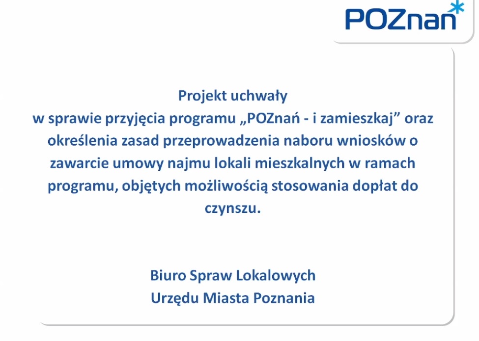 Przygotowywany przez miasto program "POZnań - i zamieszkaj" jest jednym z elementów realizacji "Polityki mieszkaniowej Miasta Poznania na lata 2017-2027". Ma pomagać w zabezpieczeniu potrzeb lokalowych mieszkańców, którzy mają dochody zbyt wysokie, by ubiegać się o przydział mieszkania komunalnego, ale jednocześnie zbyt niskie, by uzyskać kredyt hipoteczny. Miasto chce im zaoferować wsparcie.