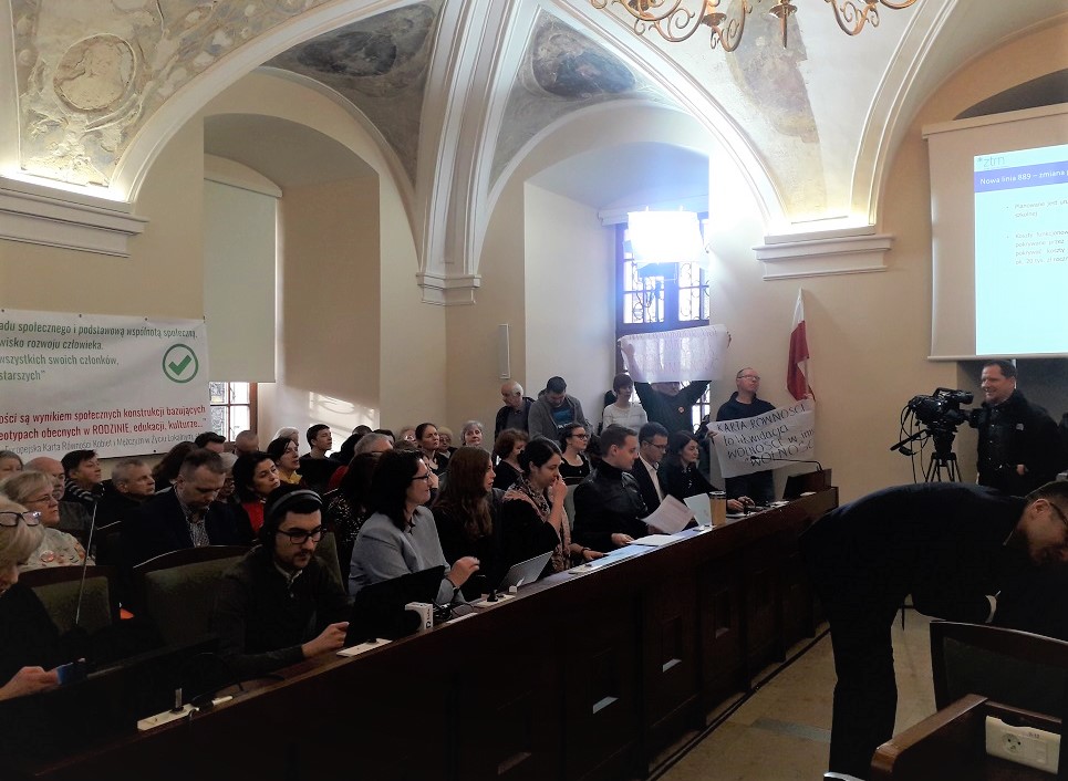 W sali sesyjnej oraz w sali obok zebrała się duża grupa osób protestujących przeciwko dokumentowi. Niektórzy z nich wywiesili transparenty, inni odmawiali modlitwy i palili świece. - Państwo możecie z tego nie korzystać, ale nie zabraniajcie tego innym - apelował do nich Sternalski. Zapraszał też do współpracy nad tworzeniem programu działania, który umożliwia karta.