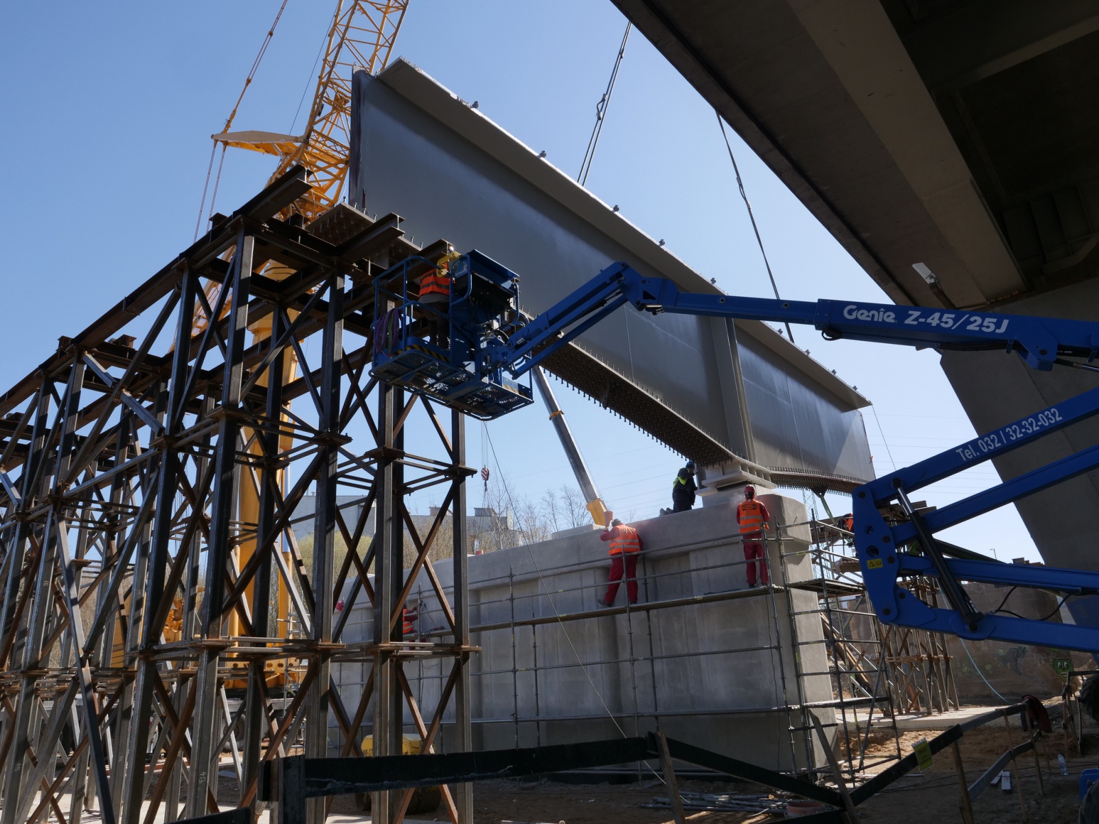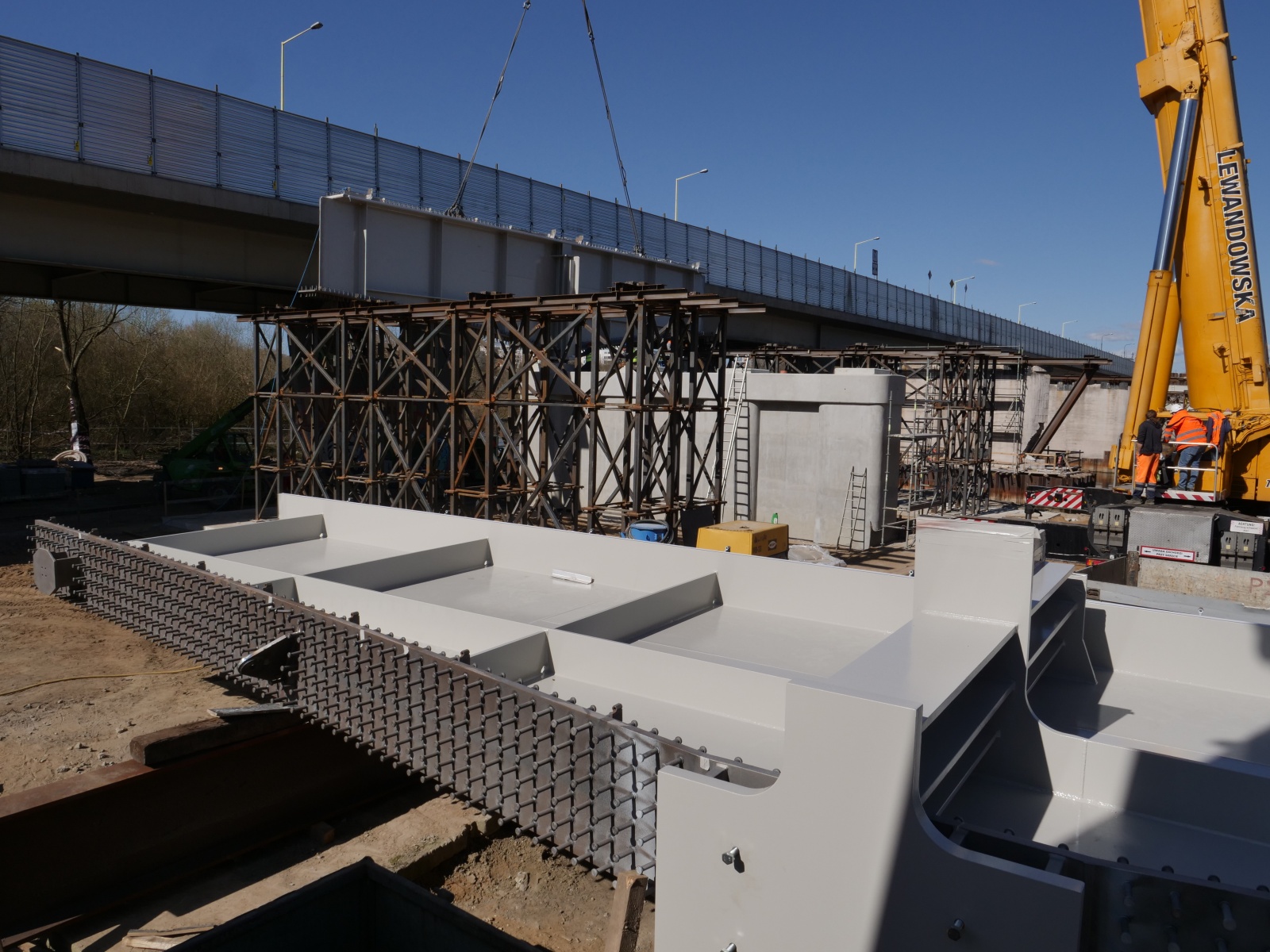 Segmenty będą montowane na przygotowanych konstrukcjach wsporczych z wykorzystaniem starych podpór mostu. Do montażu wykorzystany jest żuraw o udźwigu 500 t. Po montażu nastąpi scalenie konstrukcji poprzez spawanie i wykonanie zabezpieczenia antykorozyjnego. Zasadnicze prace związane z montażem konstrukcji stalowej zakończą się do końca czerwca.