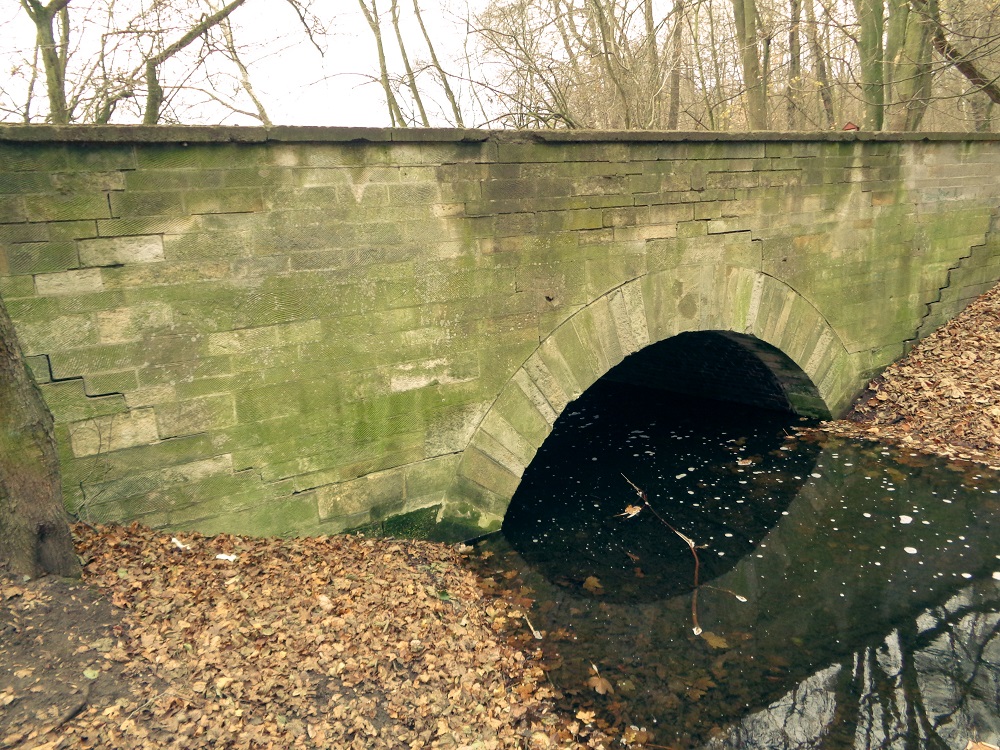 - [Zdjęcie 1] Fragment mostku, po zachodniej stronie Jeziora Rusałka, przy ujściu do jeziora potoku Bogdanka. Nad przęsłem mostku znajduje się kamień, na którym wyryto datę 1941 (początek tworzenia niecki jeziora) oraz herb Poznania stosowany przez okupanta niemieckiego podczas II wojny światowej