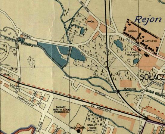 - [Zdjęcie 3] Fragment Planu Stołecznego Miasta Poznania z 1935 r., przedstawiający miejsce, w którym kilka lat później, w czasie wojny powstało Jezioro Rusałka. Na planie widzimy przebieg strumienia Bogdanka, glinianki, oraz starą ulice Glinianą, po której pozostał dziś jedynie wschodni odcinek, przebiegający w rozwidleniu tras kolejowych