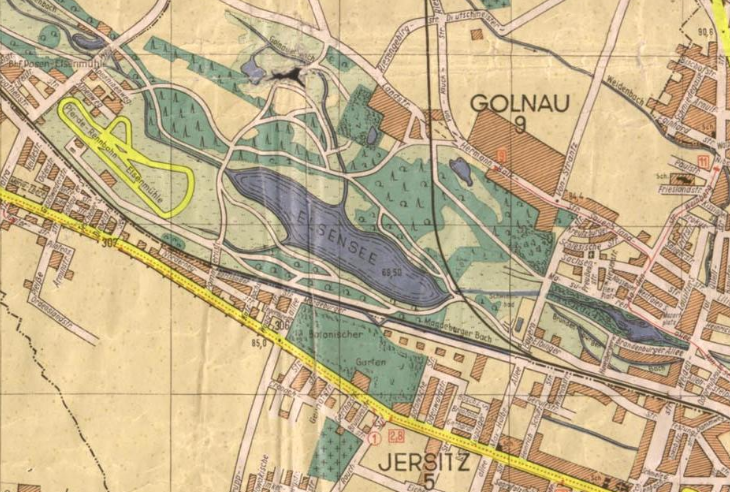 - [Zdjęcie 4] Fragment planu "Gauhauptstadt Posen" z października 1943 r. z widocznym już akwenem dzisiejszego Jeziora Rusałka, nazwanego wówczas Elsensee (okresowo funkcjonowała też nazwa Westsee); źródło CYRYL