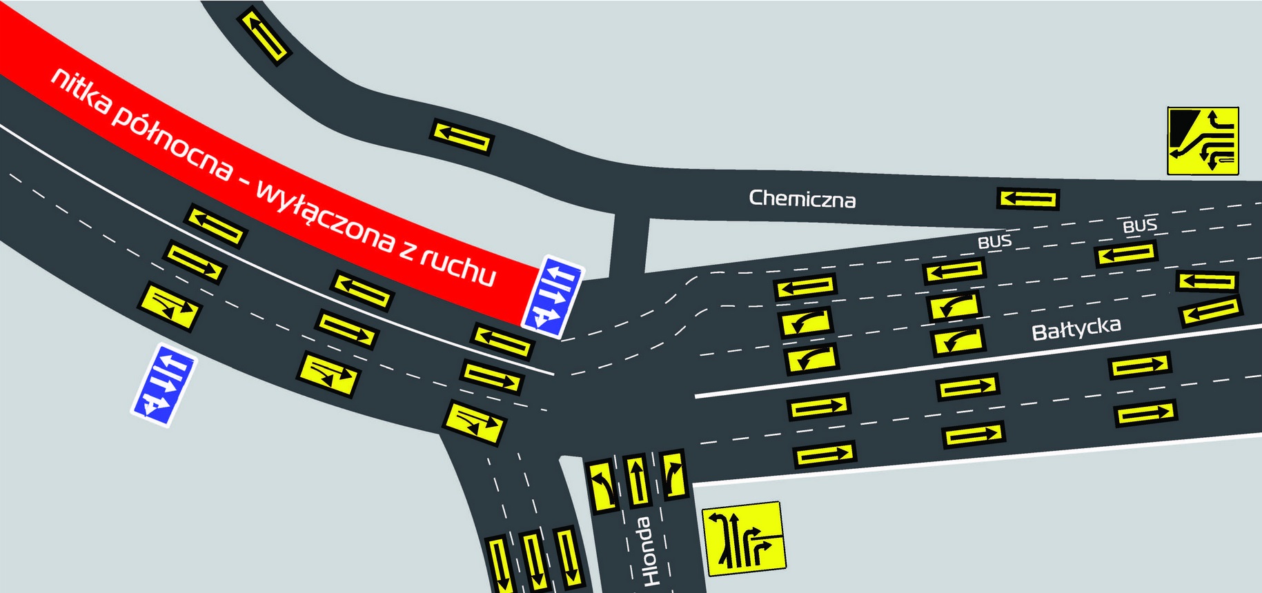 Szczegółowe informacje na temat zmienionej organizacji ruchu i związanej z tym konieczności zmiany jezdni i pasów ruchu na przylegających do mostu skrzyżowaniach pojawią się na tablicach umieszczonych 150 m przed skrzyżowaniami ul. Hlonda z ul. Bałtycką oraz ul. Serbskiej i ul. Lechickiej.