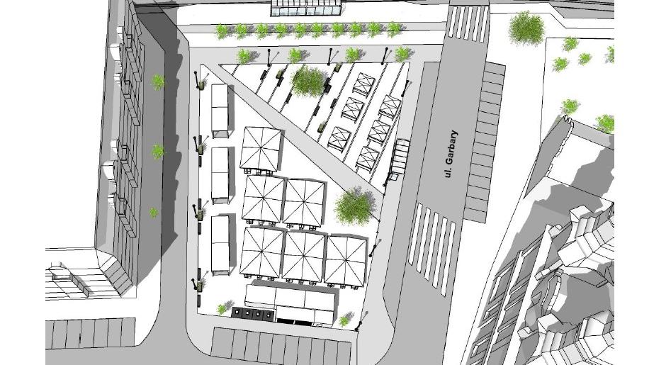 Zostanie rozdzielony przejściem po skosie od ul. Za Bramką w kierunku kościoła franciszkanów. Część od strony przystanku tramwajowego będzie pełniła funkcję rekreacyjną i handlową. Pojawi się tam też urządzona zieleń, będzie też tak jak obecnie, przebiegała droga dla rowerów. Drugi fragment placu będzie przeznaczony wyłącznie na funkcję handlową z zapleczem w postaci toalety i podziemnych kontenerów na śmieci.