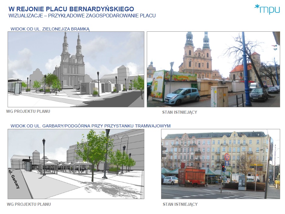 - Nowy miejscowy plan jest zgodny z obecnymi trendami dla takich miejsc jak plac Bernardyński - mówiła Elżbieta Janus, szefowa Miejskiej Pracowni Urbanistycznej. Zapisy planu będą punktem wyjścia, dla projektantów, kiedy zapadnie decyzja o remoncie płyty placu Bernardyńskiego.