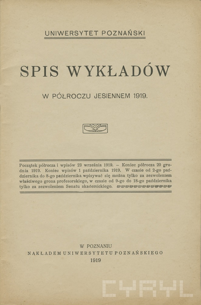 Spis wykładów, które odbywały się na Uniwersytecie Poznańskim jesienią 1919 roku, to rewelacyjne źródło do historii uczelni. Ciekawy jest już fakt, że na stronie tytułowej broszury widnieje nazwa Uniwersytet Poznański, a w licznych źródłach znajduje się informacja, iż w tym czasie uczelnia nosiła jeszcze oficjalną nazwę Wszechnicy Piastowskiej (nazwę Uniwersytet Poznański otrzymała dopiero rozporządzeniem z 10 kwietnia 1920 roku). Pierwszym wydziałem nowej szkoły wyższej był Wydział Filozoficzny powołany 1 kwietnia 1919 roku, ponad miesiąc przed oficjalną inauguracją uczelni 7 maja 1919 roku. Jesienią szkoła miała już trzy wydziały: Filozoficzny, Prawa i Nauk Ekonomiczno-Politycznych oraz Rolniczo-Leśny. Spis pokazuje, jakie tematy realizowano w pierwszym roku działalności uczelni, a przede wszystkim, kto je prowadził. Wśród wykładowców znajdują się nazwiska wybitnych naukowców i nauczycieli akademickich, profesorów, którzy na zawsze zapisali się w historii Poznania: Sobeskiego, Peretiatkowicza, Zakrzewskiego, Skałkowskiego, Kostrzewskiego, Dettloffa, Pollaka, Grochmalickiego, Taylora czy Schramma. Niepozorne wydawnictwo o wielkiej wadze dla badaczy dziejów miasta i najstarszego poznańskiego Uniwersytetu.