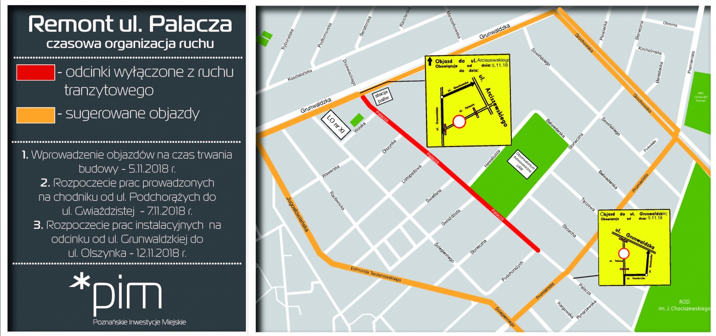 Przez cały czas trwania prac remontowych zachowana zostanie możliwość dojazdu i dojścia do posesji zlokalizowanych przy ul. Palacza, a ruch tranzytowy do ul. Grunwaldzkiej zostanie poprowadzony objazdami - przez ulice Arciszewskiego, Promienistą, Grochowską, Ściegiennego, Taczanowskiego i Jugosłowiańską. Ruch od ul. Grunwaldzkiej w kierunku ul. Arciszewskiego zostanie poprowadzony ulicami Grunwaldzką oraz Grochowską.