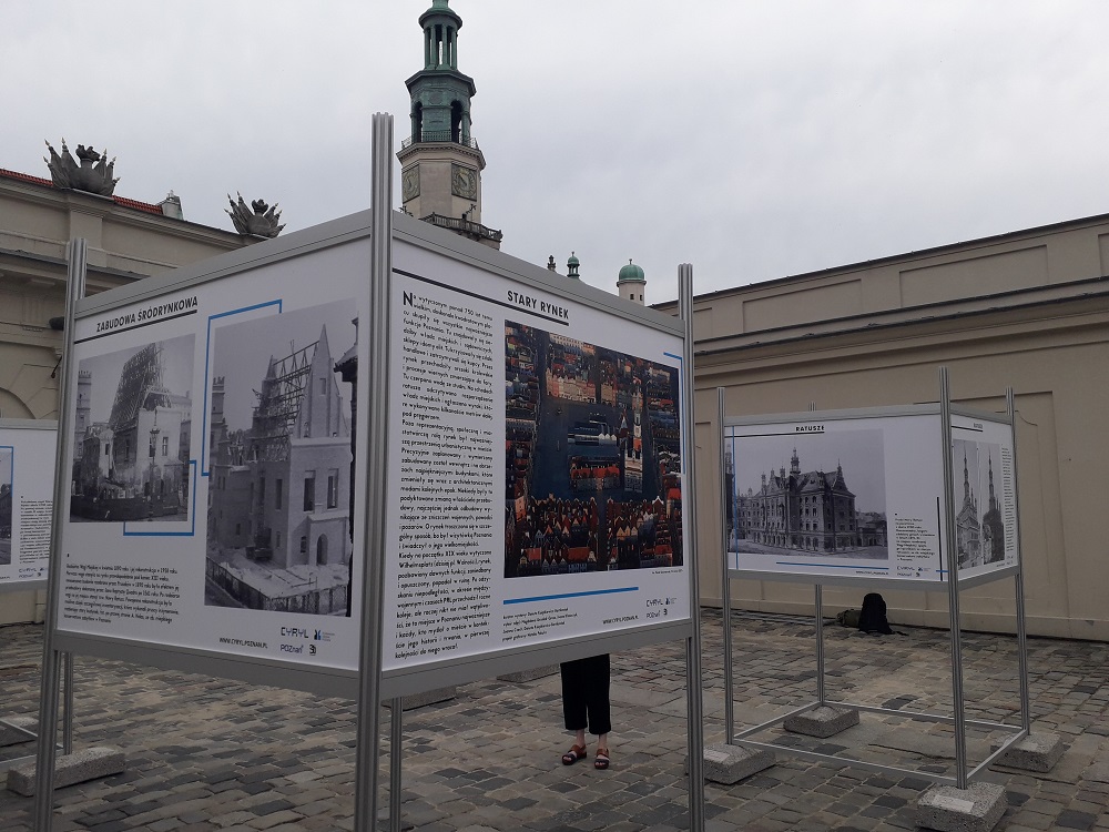 Na każdym z czterech stelaży wystawienniczych pokazano krótką historię kolejno: ratusza, zabudowy śródrynkowej, domków budniczych i rynkowych pierzei. Dziewiętnaście fotografii jest własnością MKZ, jedyna kolorowa to współczesne zdjęcie rynku wykonane przez Marka Kaczmarczyka, który od wielu lat fotografuje Poznań z lotu ptaka.