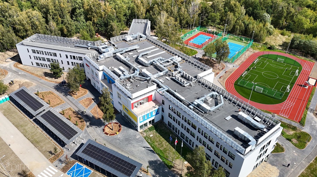 Otoczenie budynku to trzy boiska - dwa mniejsze i jedno duże do piłki nożnej, wokół którego powstała bieżnia. Place zabaw - osobne dla dzieci szkolnych i przedszkolnych - zostały już wyposażone w urządzenia. Gotowe są również wiaty rowerowe, na których zamontowano panele fotowoltaiczne. Całość dopełniają miejsca parkingowe, alejki i nowa zieleń. Teren jest oświetlony i wyposażony w małą architekturę, jak ławki i kosze na śmieci.