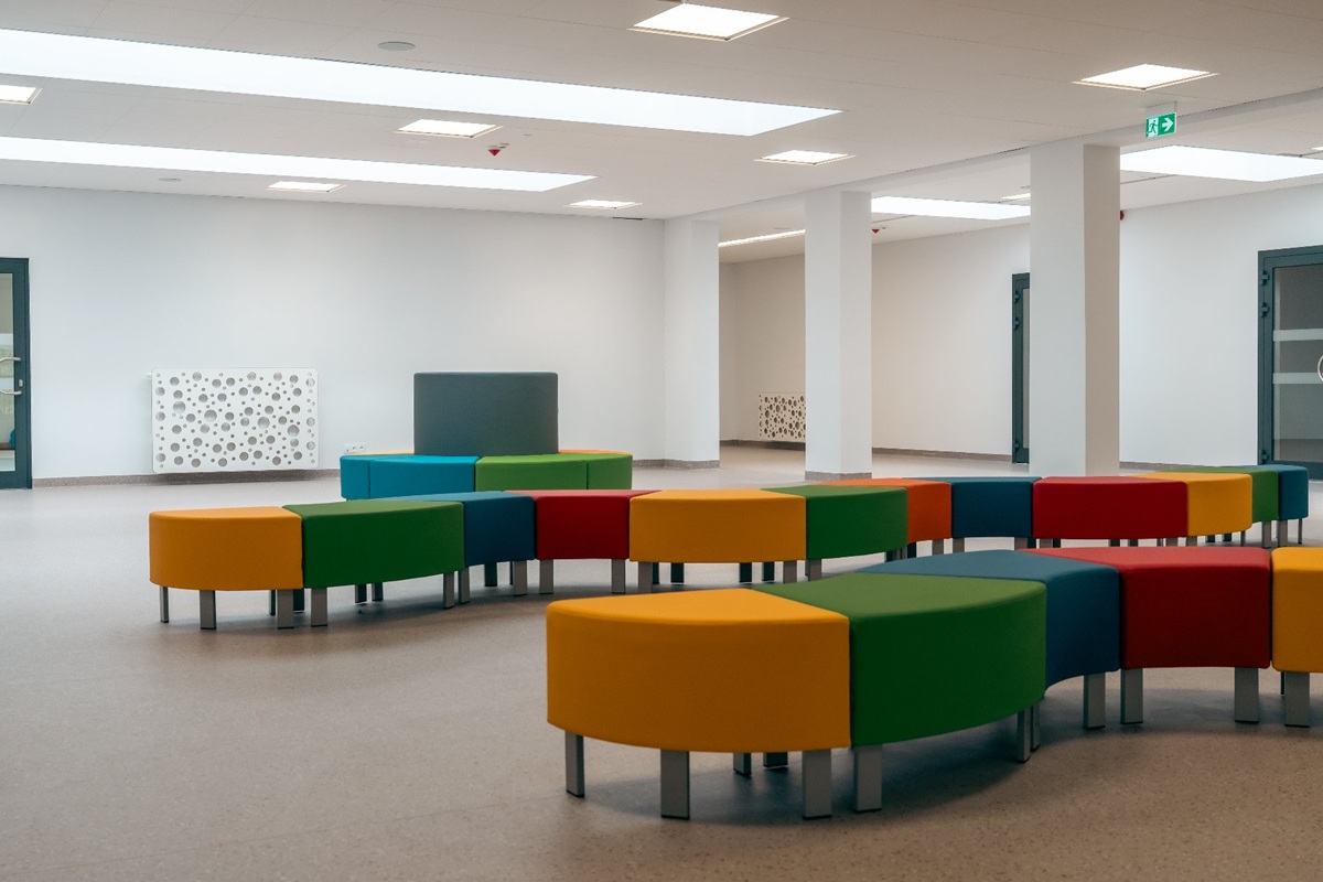 Z lotu ptaka szkoła przypomina literę Y. To nie przypadek - w ten sposób w budynku wydzielono strefy dla dzieci młodszych, starszych i najstarszych. W lewym skrzydle powstało przedszkole z odrębnym wejściem, a w prawym i na dole - sale lekcyjne dla dzieci ze szkoły podstawowej (podział na klasy 1-3 i 4-8). Wszystkie trzy skrzydła spotkają się w centralnej części wspólnej o charakterze integracyjnym. Jest tam przestronny hol główny i sala gimnastyczna. W środkowej części szkoły znajdują się również: stołówka z zapleczem kuchennym, biblioteka, świetlica oraz pomieszczenia administracyjne i techniczne.