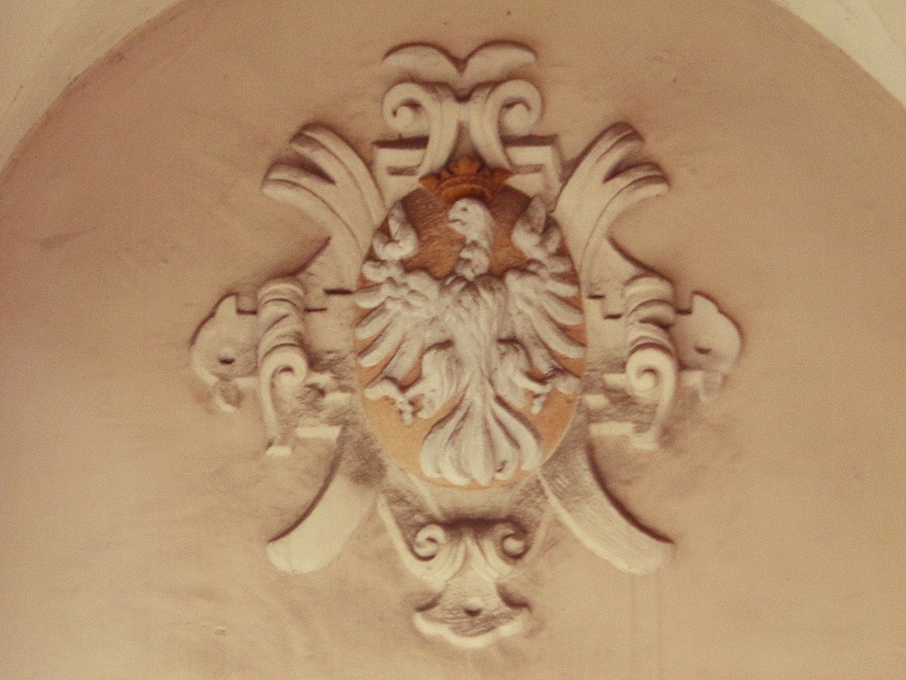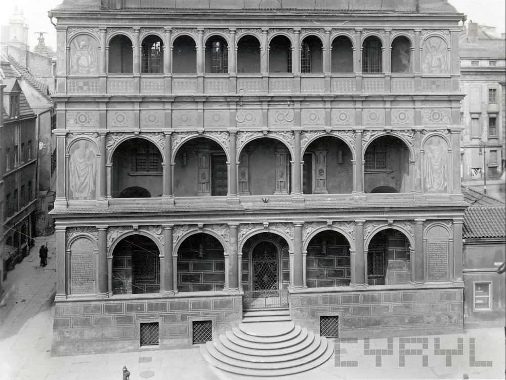 Gdy staniemy bliżej ratuszowej elewacji i wytężymy wzrok, w głębi, na wewnętrznej ścianie loggii pierwszego piętra zauważymy tajemnicze tarcze i kartusze. Z płyty Starego Rynku widać tylko niektóre z nich. Dopiero wejście do wnętrza loggii (niemożliwe na co dzień) pozwoli nam na obejrzenie kompletu tych tajemniczych dekoracji. Część bowiem umieszczono na murnej ścianie loggii, niewidocznej z zewnątrz.