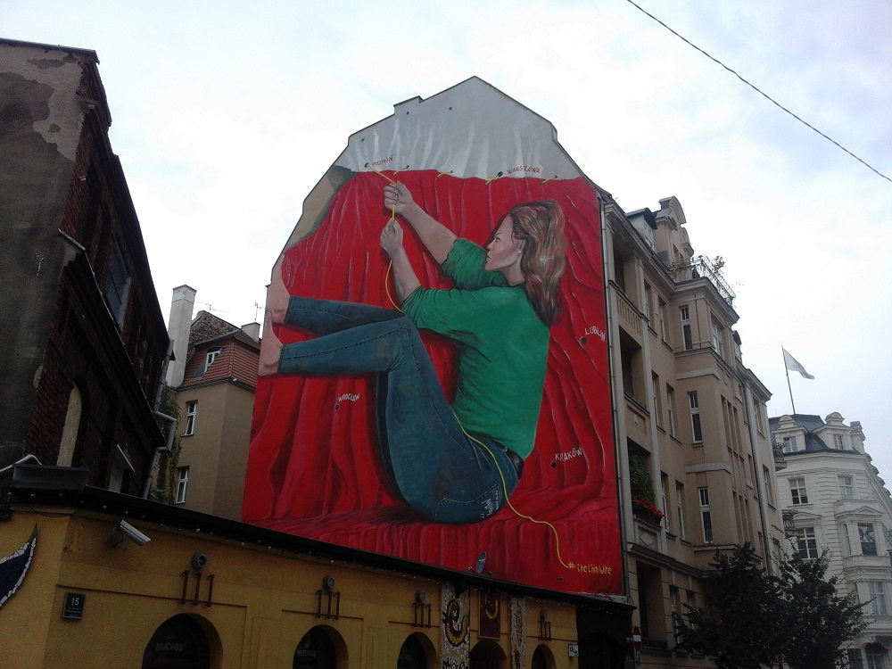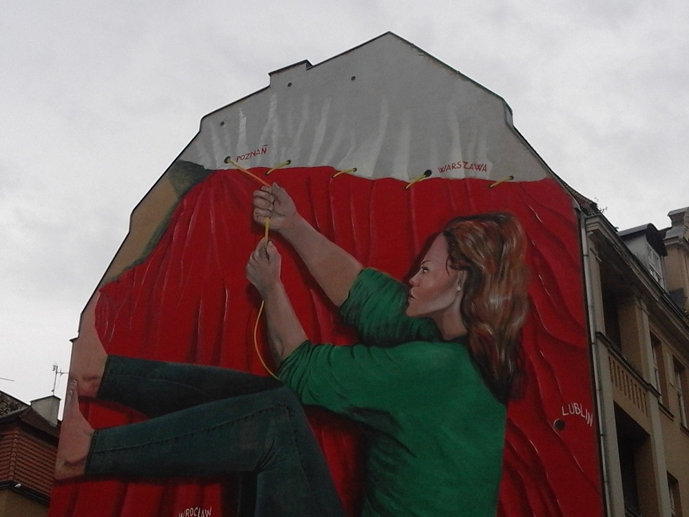 Mural znajduje się na ścianie budynku przy ul. Nowowiejskiego, na odcinku między ul. 23 lutego a ul. Młyńską. Przedstawia młoda kobietę, która próbuje zszyć dwie części materiału - białą i czerwoną, jak kolory naszej flagi. Na malowidle widać też nazwy pięciu polskich miast: Poznania, Warszawy, Wrocławia, Krakowa i Lublina.