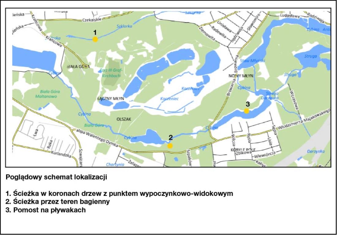 Inwestycja, której wartość wynosi ok. 4,2 mln zł ma na celu opracowanie dokumentacji projektowej, a następnie wybudowanie szeregu obiektów przeznaczonych do aktywnego wypoczynku na terenach leśnictwa Antoninek - m.in.: pomostu na pływakach oraz ścieżek przez tereny bagienne i w koronach drzew. Całość uzupełni mała architektura. Poszczególne elementy szlaku pozwolą w pełni wykorzystać rekreacyjne walory malowniczego terenu i będą pełniły funkcje poznawcze oraz komunikacyjne na obu brzegach doliny.