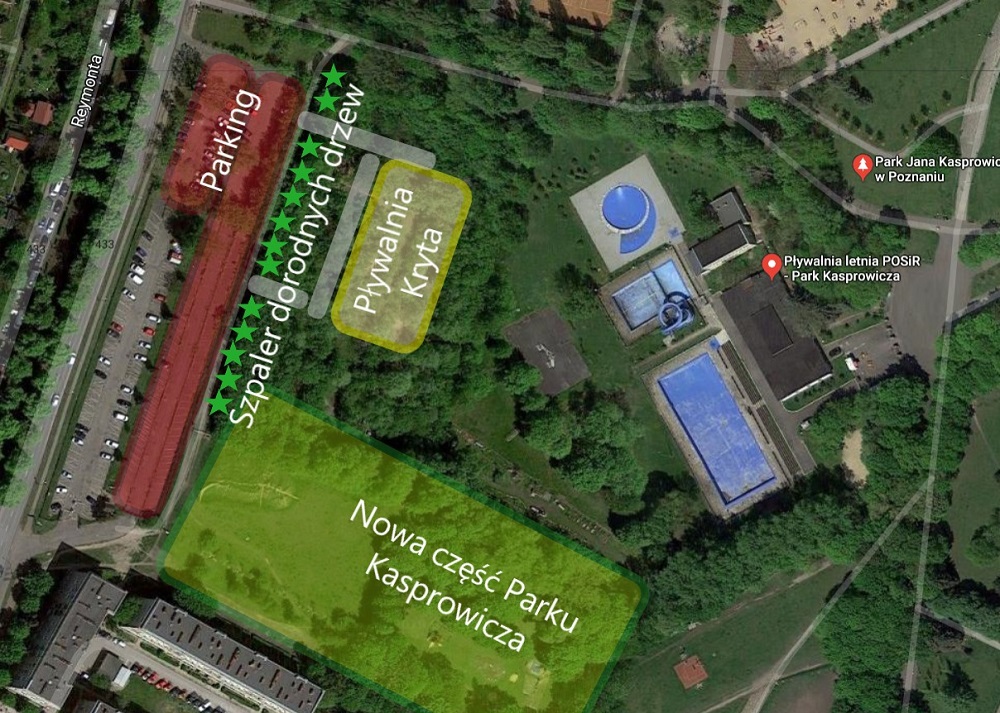 Propozycje radnego zmierzają do: wkomponowania pływalni w otaczającą zieleń i ochrony najcenniejszych przyrodniczo drzew; powiększenia Park Kasprowicza w kierunku ul. Reymonta o tereny obecnie ogrodzone, rezygnacji z dodatkowych miejsc parkingowych w otoczeniu pływalni, wyremontowania istniejącego parkingu przy ul. Reymonta i wyznaczenia miejsc dla autobusów dowożących dzieci ze szkół, zmiany przebiegu drogi przeciwpożarowej, aby nie tworzyć zbędnego utwardzonego placu manewrowego.