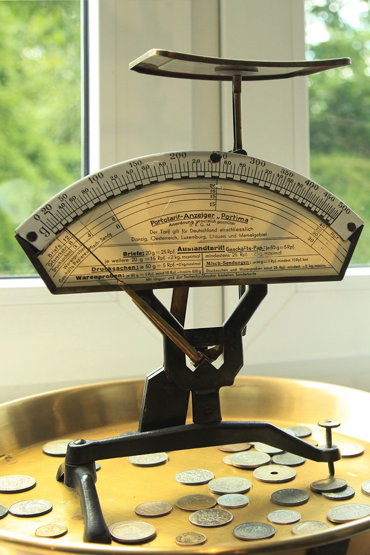 W zbiorach pochodzących z różnych kontynentów najstarszym eksponatem jest waga do ważenia złotych monet - pochodzi z lat 70. XVIII wieku, a wykonana została przez Johanna Petera Braselmanna z Wichlinghausen (na terenie Wuppertalu w Nadrenii Północnej-Westfalii, regionie znanym z produkcji wag monetarnych). Zestaw składa się z równoramiennej wagi z dwiema szalkami oraz drewnianego etui z równoważnikami monet i odważnikami blaszkowymi. Na jej francuskim odpowiedniku z końca XIX wieku umieszczono także tabelę z wagami złotych i srebrnych monet używanych wówczas w różnych krajach Europy.