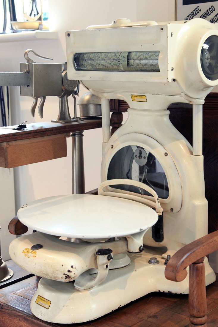 Dumą gospodarza jest też, budząca szczególne zaciekawienie zwiedzających, waga osobowa z 1929 roku, wyprodukowana przez warszawską Fabrykę Wag Weber-Dähnes. Masę pacjenta, zasiadającego na specjalnym drewnianym fotelu (udźwig 200 kg!), można odczytać przy pomocy zespołu trzech przesuwników, a potem - używając specjalnego mechanizmu - wykonać wydruk (odcisk) wyniku na kartoniku. Wagi tego typu używane były dawniej w szpitalach i w większych aptekach. W zbiorach muzeum jest także uliczna automatyczna waga osobowa, identyczna jak ta stojąca "od niepamiętnych czasów" przy Al. Marcinkowskiego w Poznaniu, która - mam nadzieję - zostanie wkrótce odremontowana, by ku uciesze przechodniów służyć przez kolejne dziesiątki lat. Pamiętam, jak w młodzieńczych latach, odwróciwszy na chwilę uwagę stojącego na wadze kolegi, podmieniliśmy mu wydruk z wagi. Nietrudno wyobrazić sobie, jaką miał minę, czytając na bileciku: "Proszę wchodzić pojedynczo"... przyznaję, że mieliśmy sporo uciechy, patrząc na naszego grubasa.