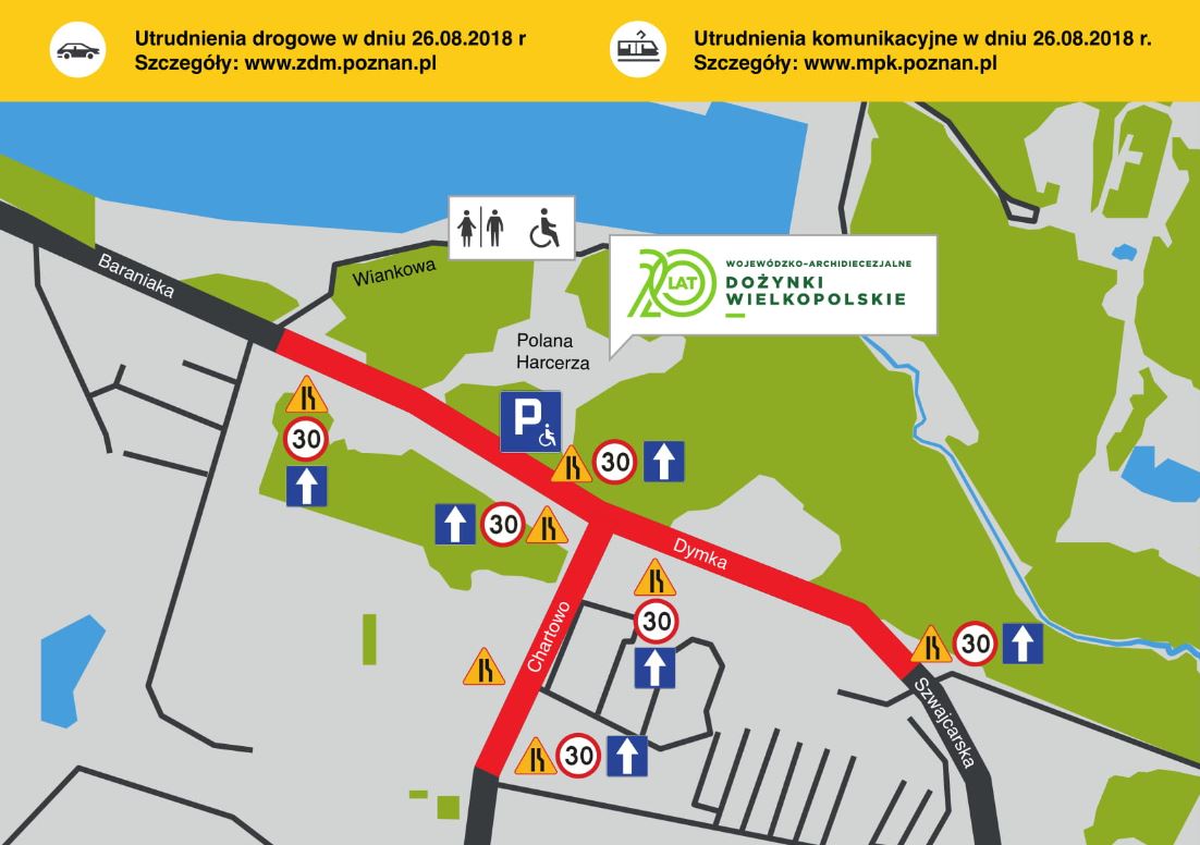 W czasie imprezy obie jezdnie ul. Baraniaka pomiędzy ul. Inflancką i ul. Chartowo oraz obie jezdnie ul. Dymka między ul. Chartowo i ul. Szwajcarską będą zwężone, a skrajne prawe pasy obu jezdni będą przeznaczone na miejsca do parkowania dla autokarów zaproszonych grup zorganizowanych. Parkowanie autobusów dla uczestników uroczystości będzie możliwe także na prawych pasach ul. Chartowo pomiędzy ul. Kurlandzką i ul. Baraniaka (z wyjątkiem rejonów skrzyżowań i przystanków).