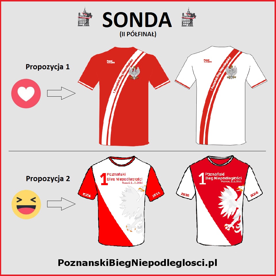 Drugi z proponowanych projektów wyróżnia pokaźny, zbliżony do współczesnego orzeł oraz nieco większe napisy. Organizatorzy zastanawiają się czy w tym przypadku nie będzie trudniej ułożyć żywą flagę z biegaczy, ze względu na niejednolitą kolorystykę rękawków i tułowia. Niemniej postanowili nie naruszać wizji twórcy i nie modyfikować koszulki na tym etapie. Głosując na ten projekt klikamy na emotikon "HAHA", zgodnym z symbolem na grafice poniżej.