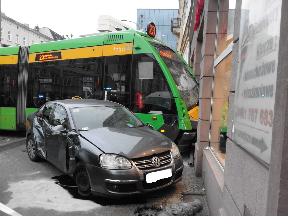 Bardzo groźnie wyglądający wypadek na Al. Marcinkowskiego. Tramwaj linii 23 wypadł z szyn i uderzył w ścianę kamienicy.