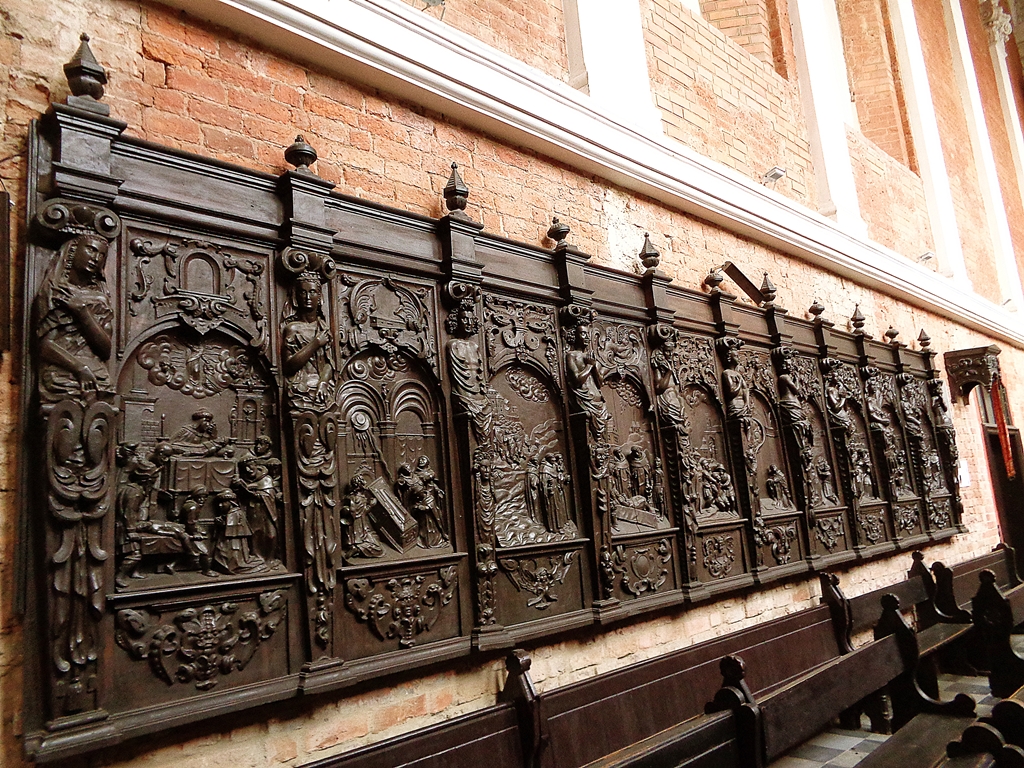W kościele podominikańskim, położonym u zbiegu ulic Szewskiej i Dominikańskiej stalle dla zakonników nie zachowały się. W prezbiterium natomiast obejrzeć możemy unikatowe zaplecki dawnych stalli. Umieszczono je na ścianach bocznych i można powiedzieć, że dziś, gdy utraciły swą pierwotną funkcję stały się artystycznym przewodnikiem po życiorysach dwóch świętych.