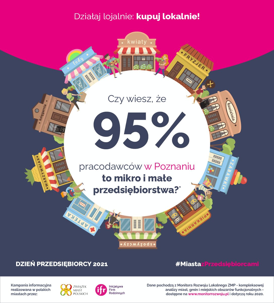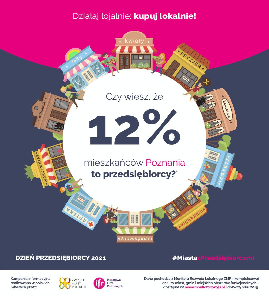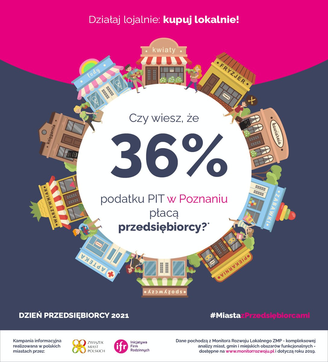 Aż 12 proc. mieszkańców stolicy Wielkopolski to przedsiębiorcy. To znacznie więcej niż średnia dla Polski, która wynosi 8 proc. Odprowadzają oni do miejskiej kasy aż 36 proc. podatku PIT - to oznacza, że każdy zakup lokalnych usług czy towarów jest równocześnie inwestycją w nasze miasto.
