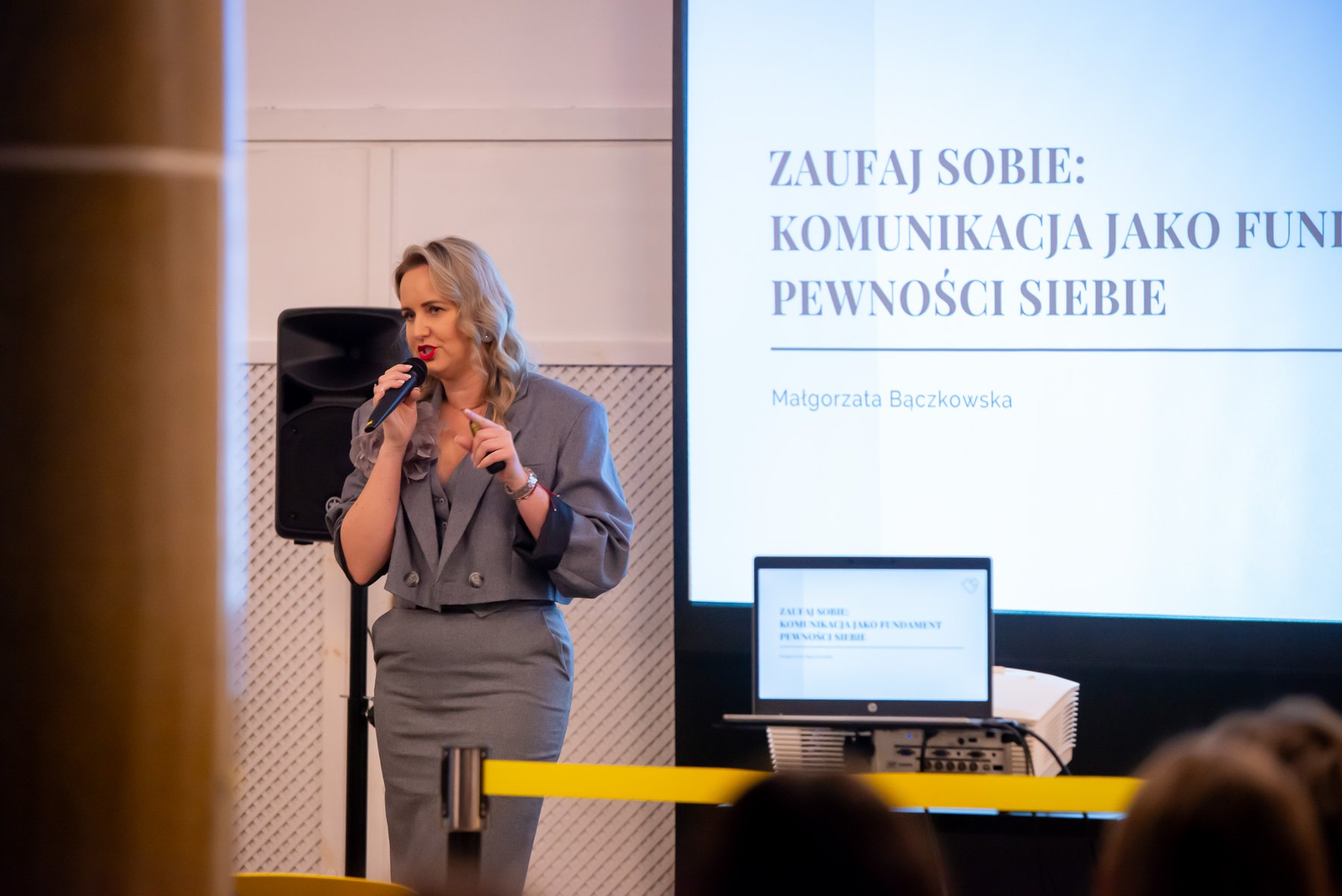 Małgorzata Bączkowska, trenerka mentalna, negocjatorka i mediatorka, poprowadziła prelekcję na temat "Zaufaj sobie: Komunikacja jako fundament pewności siebie", ukazując, jak autentyczna komunikacja z sobą i innymi może być kluczem do sukcesu. Pokazała, jak zaufanie do siebie wpływa na pewność siebie w biznesie i w życiu osobistym.