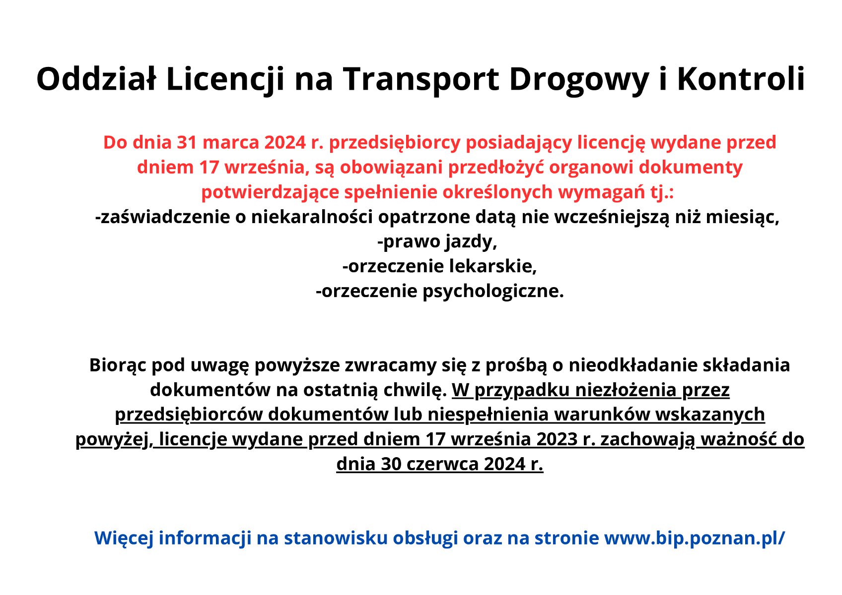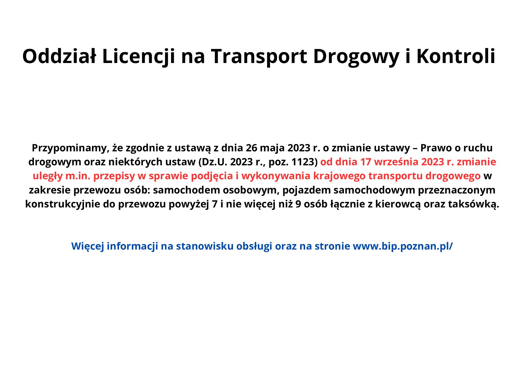 Jednocześnie, w związku z powyższym, od dnia 17 września 2023 r. zmianie uległ wzór wniosku o wydanie licencji na krajowy transport drogowy w zakresie przewozu osób taksówką oraz wymagane załączniki do wniosku, a także wniosek związany ze zgłoszeniem kierowców.