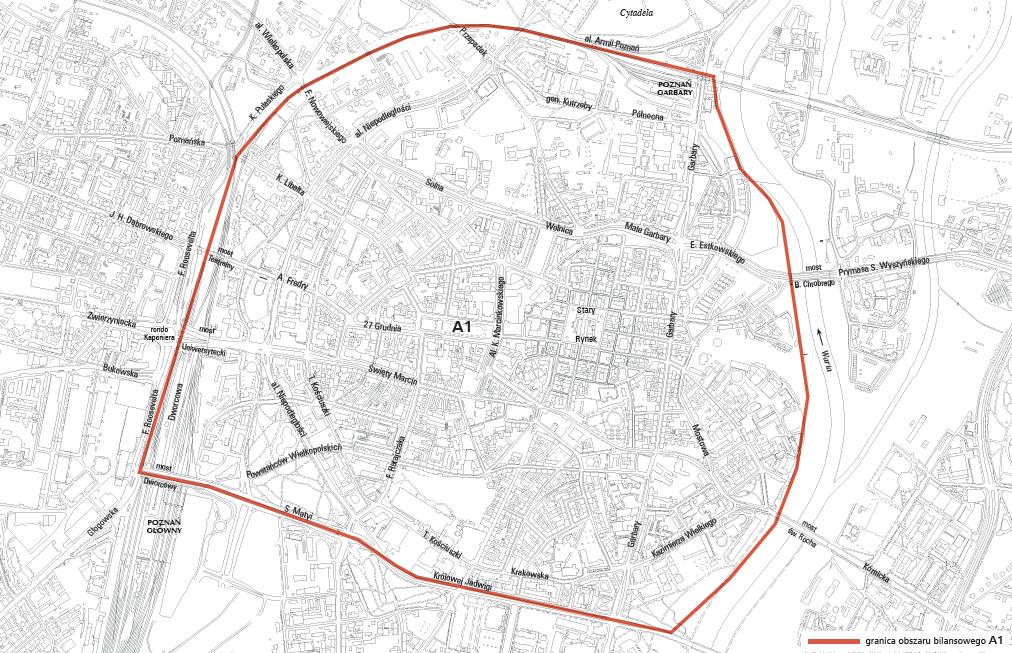 • A1 - Stare Miasto i Chwaliszewo (podobszar ograniczony: od strony wschodniej rzeką Wartą, od południowej ul. Królowej Jadwigi, od zachodniej i od północnej torami kolejowymi)