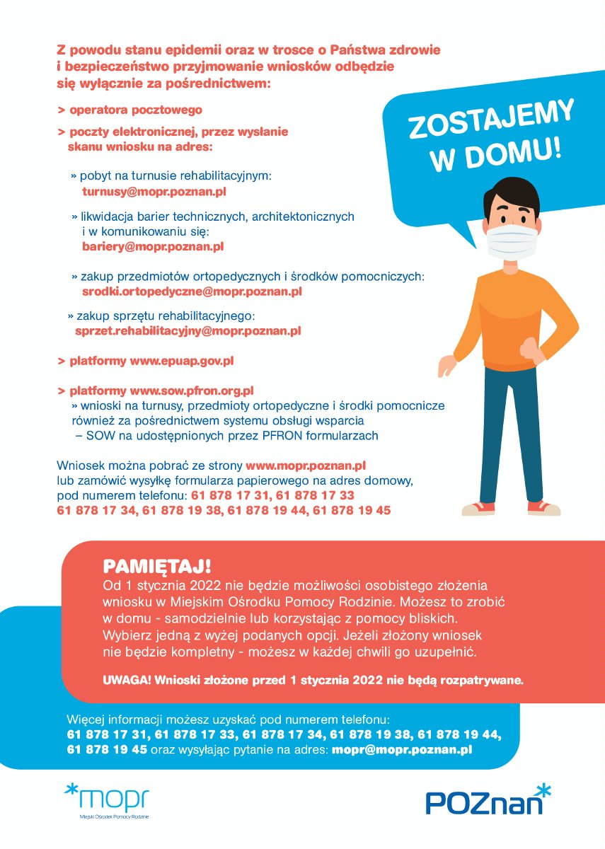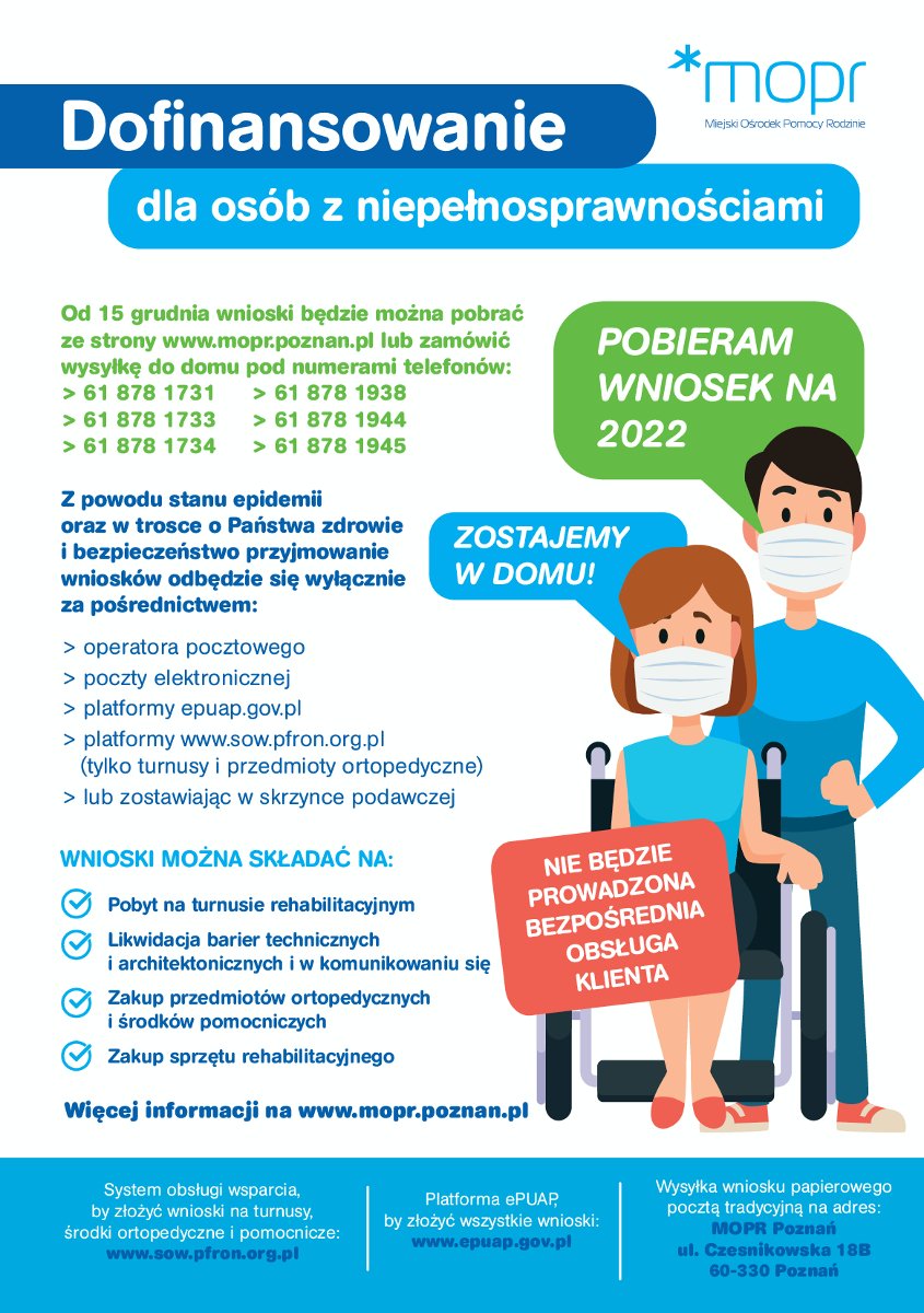 - Dofinansowanie pochodzi ze środków Państwowego Funduszu Rehabilitacji Osób Niepełnosprawnych - wyjaśnia Piotr Czajka, zastępca dyrektora Miejskiego Ośrodka Pomocy Rodzinie w Poznaniu. - Ze względu na pandemię nie będzie możliwości osobistego pobrania wniosku w siedzibie ośrodka. W trosce o zdrowie i bezpieczeństwo naszych klientów zachęcamy do korzystania z poczty tradycyjnej lub elektronicznej, platform internetowych, skrzynek podawczych oraz strony internetowej MOPR.